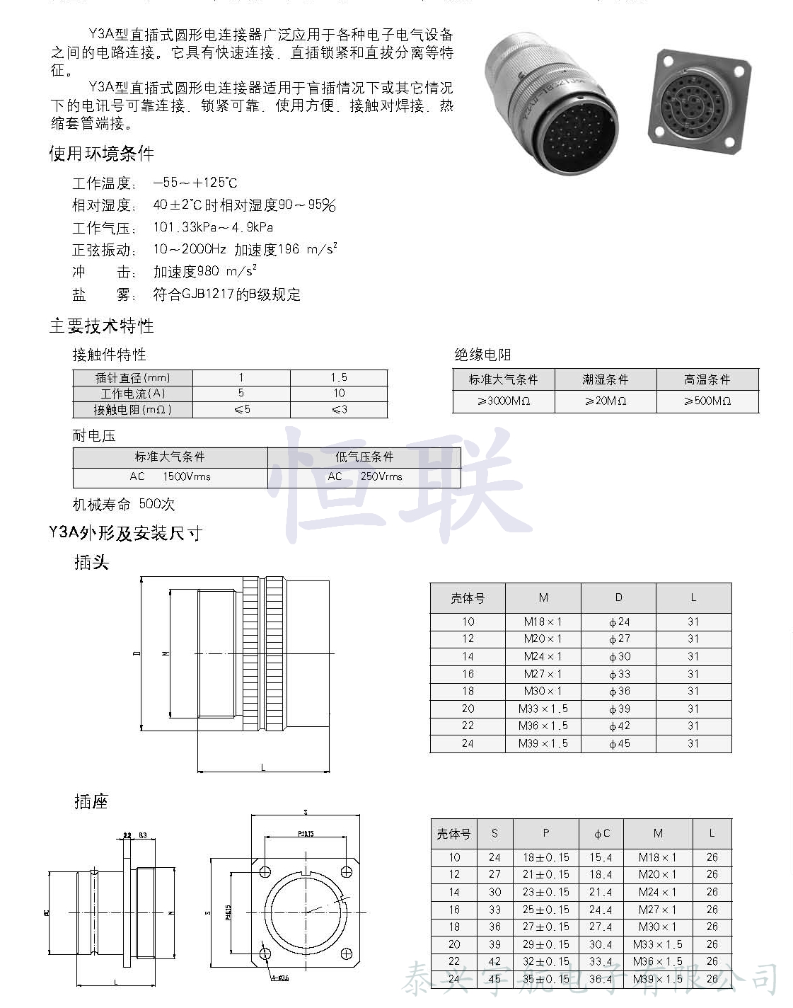 Y3A型直插式圓形電連接器適用于盲插情況下或其它情況下的電訊號可靠連接,鎖緊可靠,使用方便,接觸對焊接,熱縮套管端接
