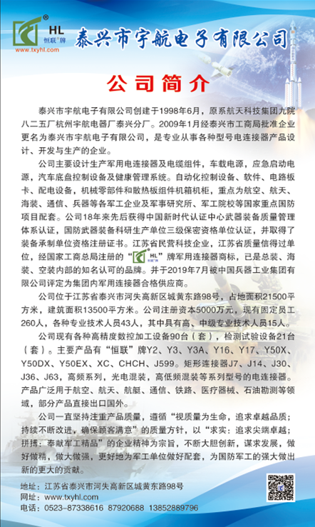 公司位于江蘇省泰興市河失高新區(qū)城黃東路98號,占地面積21500平方米,建筑面積13500平方米。公司注冊資本5000萬元,現(xiàn)有固定員工260人,各種專業(yè)技術(shù)人員43人,其中具有高、中級專業(yè)技術(shù)人員15人。公司現(xiàn)有各種高精度數(shù)控加工設(shè)備90臺(套),檢測試驗設(shè)備21臺(套)。主要產(chǎn)品有【恒聯(lián)牌】Y2、Y3、Y3A、Y16、 Y17、Y50X、Y50DX、Y50EX、 XC、CHCH、J599。 矩形連接器J7、J14、J30、J36、J63,高頻系列,光電混裝,高低頻混裝等系列型號的電連接器。產(chǎn)品廣泛用于航空、航天、航艇、通信、鐵路、醫(yī)療器械、石油勘測等領(lǐng)域,部分產(chǎn)品直接出口國外。